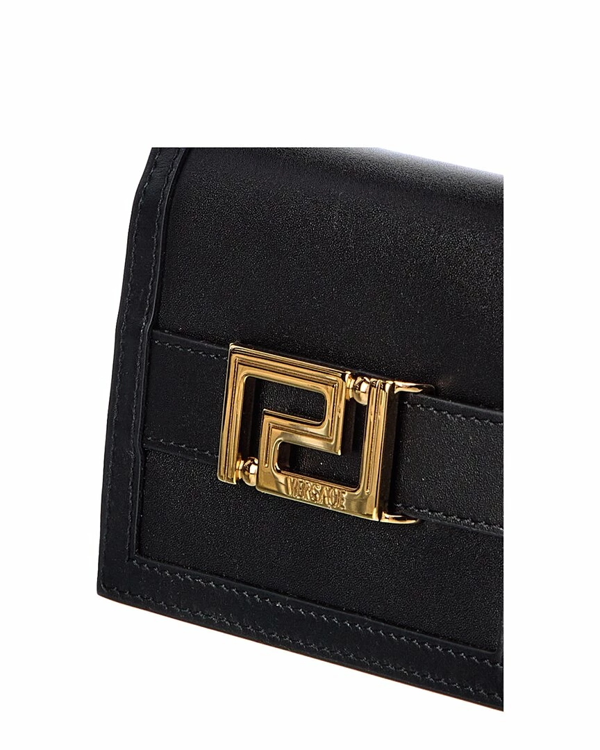 - Greca Goddess Leather Bifold French Wallet In Black Leather And Gold-Tone Hardware With Logo Accent