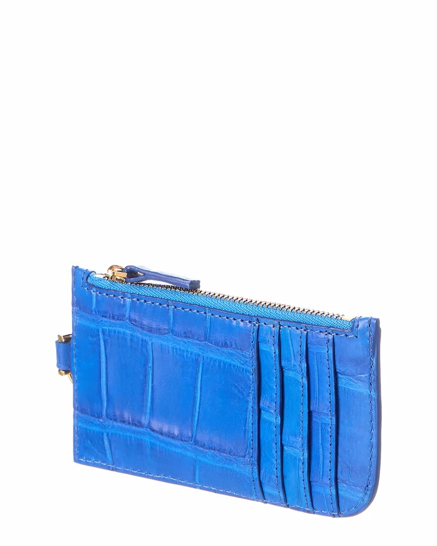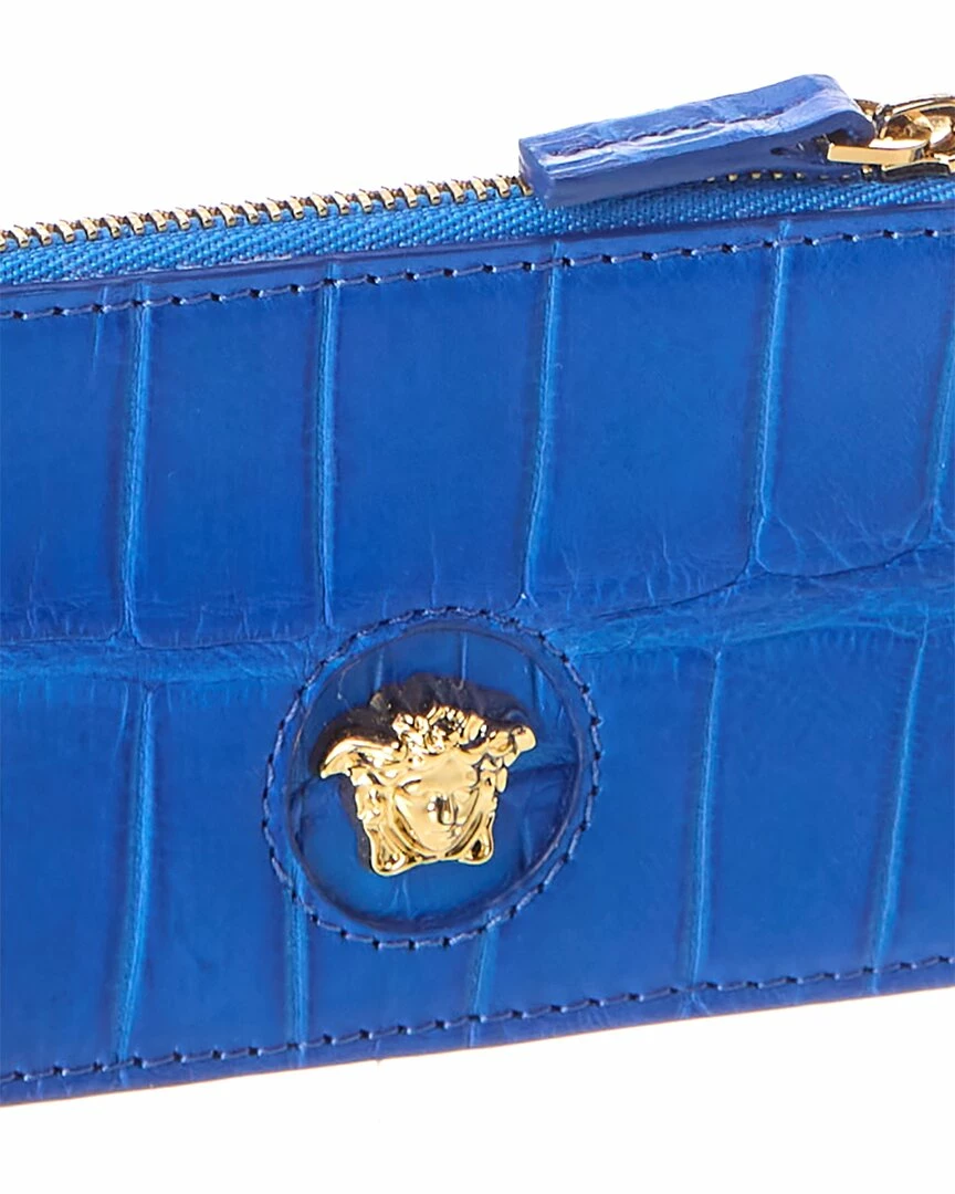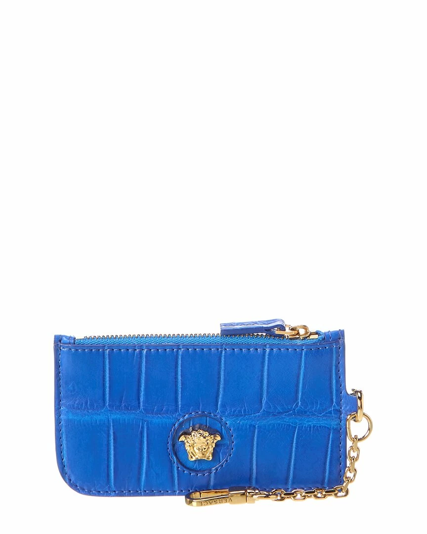 - La Medusa Croc-Embossed Leather Card Holder In Blue Croc-Embossed Leather And Gold-Tone Hardware With Medusa Head Logo Accent, Card Slots And Chain Clasp Accent