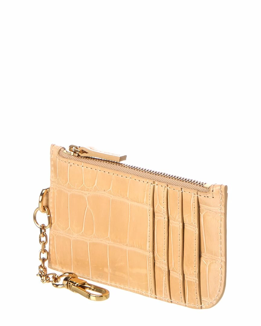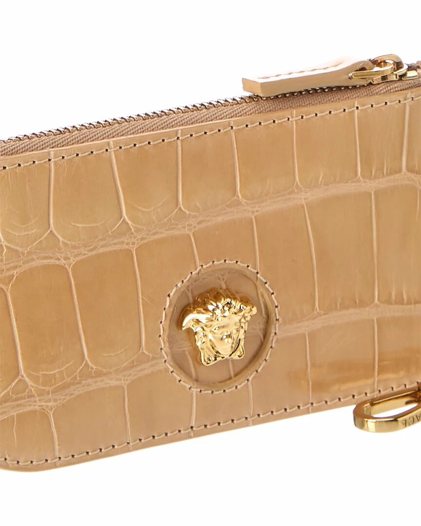 - La Medusa Croc-Embossed Leather Card Holder In Tan Croc-Embossed Leather And Gold-Tone Hardware With Medusa Head Logo Accent, Card Slots And Chain Clasp Accent