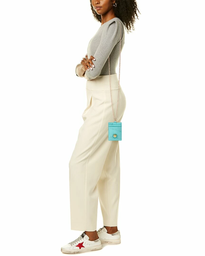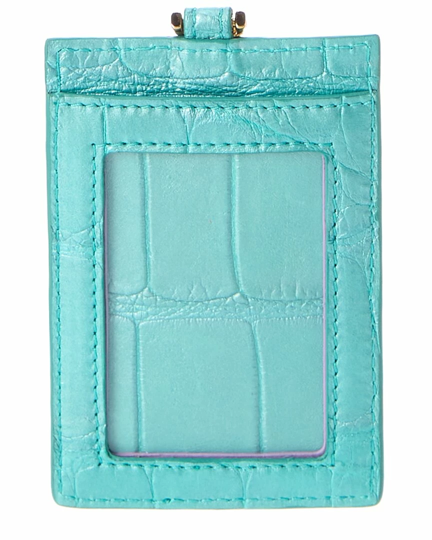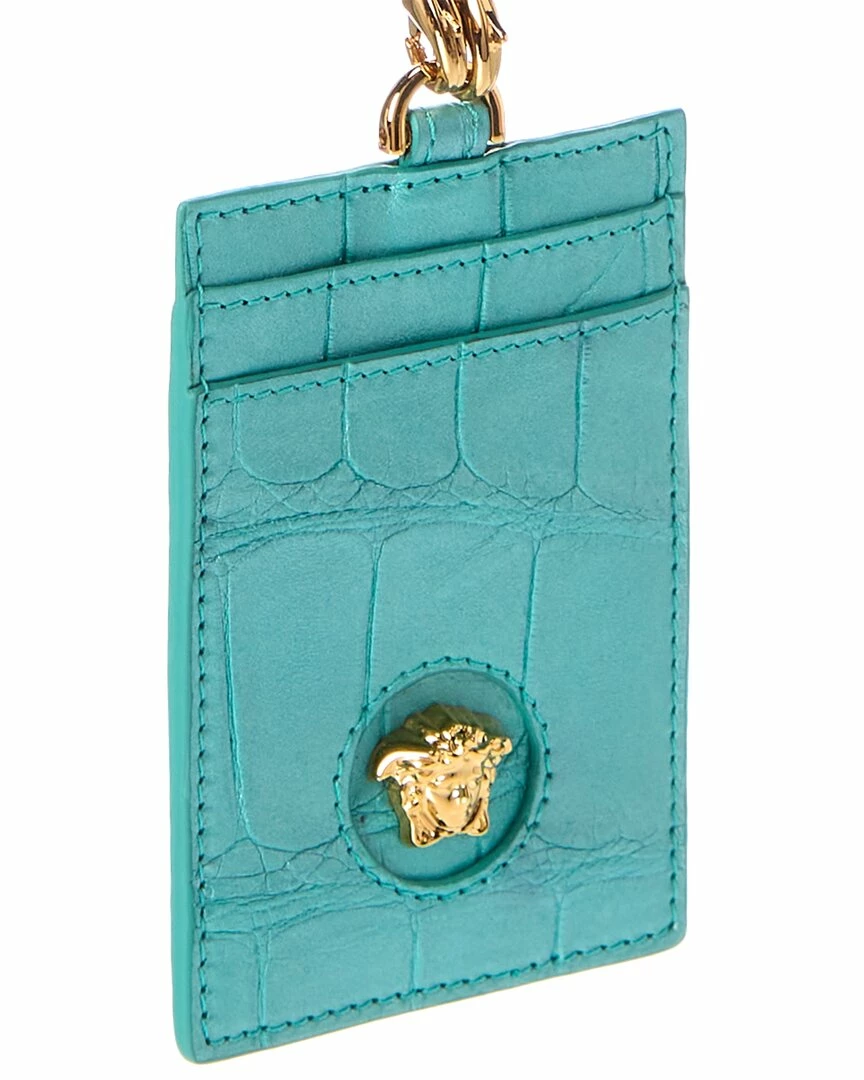 - La Medusa Croc-Embossed Leather Card Holder On Chain In Turquoise Metallic Croc-Embossed Leather And Gold-Tone Hardware With Medusa Head Logo Accent, Card Slots And Clear Id Slot