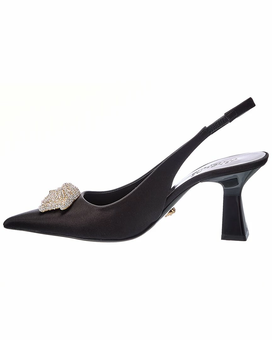 - La Medusa Satin Slingback Pump In Black Satin With Crystal-Embellished Medusa Head Logo Accent