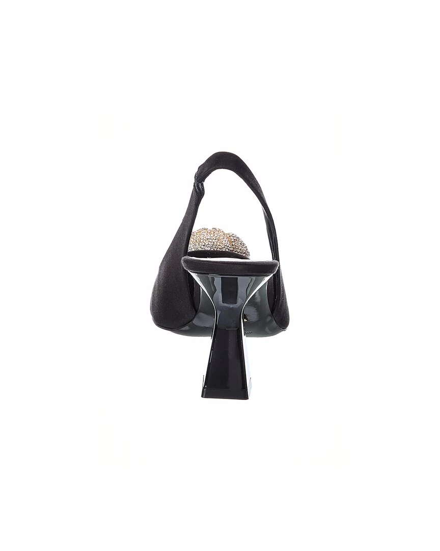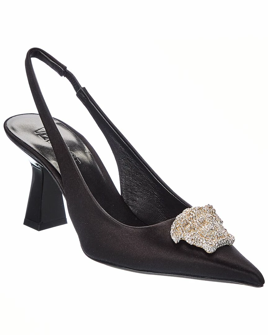 - La Medusa Satin Slingback Pump In Black Satin With Crystal-Embellished Medusa Head Logo Accent