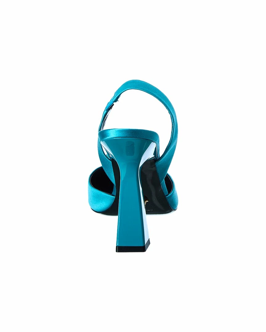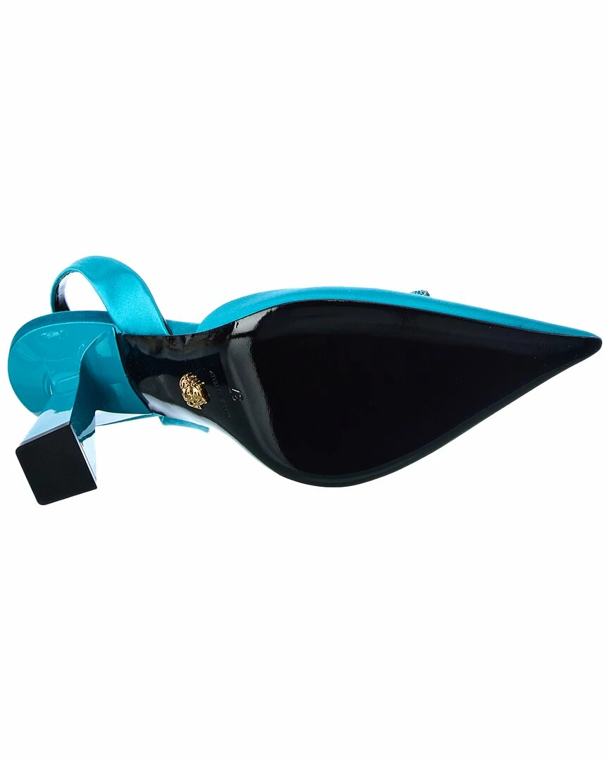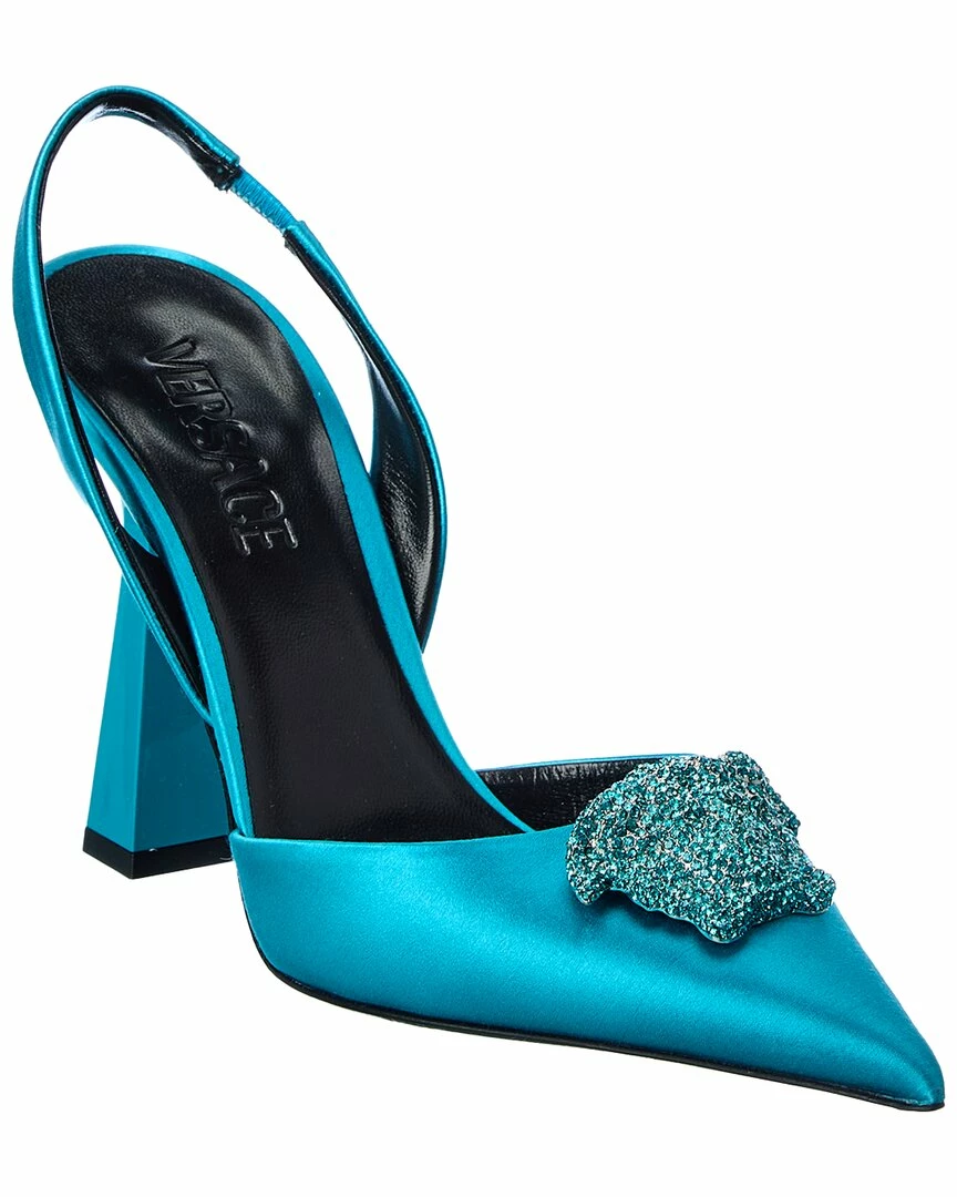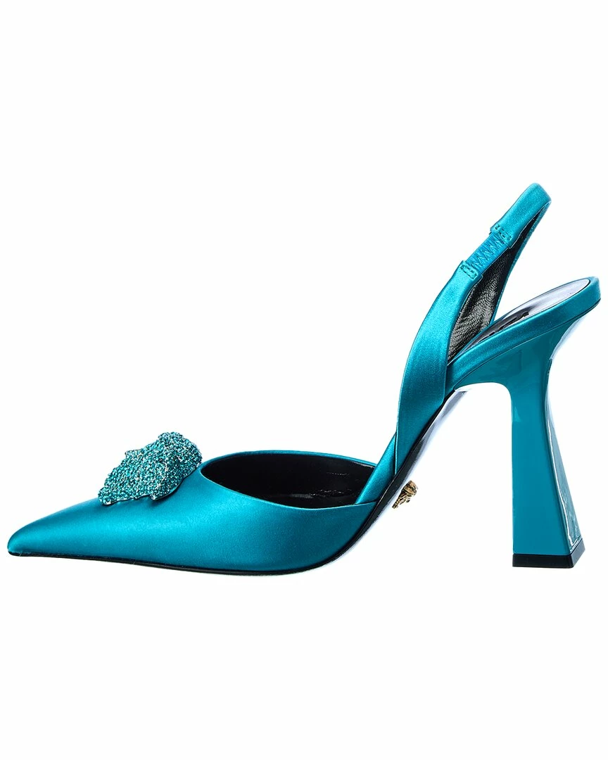 - La Medusa Satin Slingback Pump In Teal Satin With Crystal-Embellished Medusa Head Logo Accent