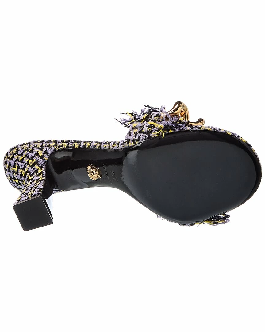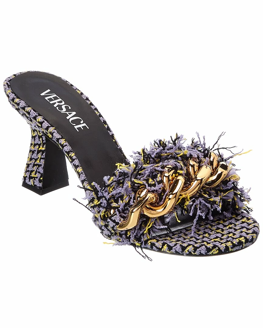- Medusa Chain Tweed Sandal In Purple And Green Tweed And Gold-Tone Hardware With Chain Accent And Frayed Trim