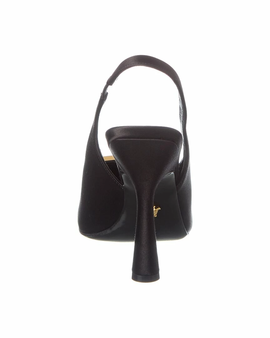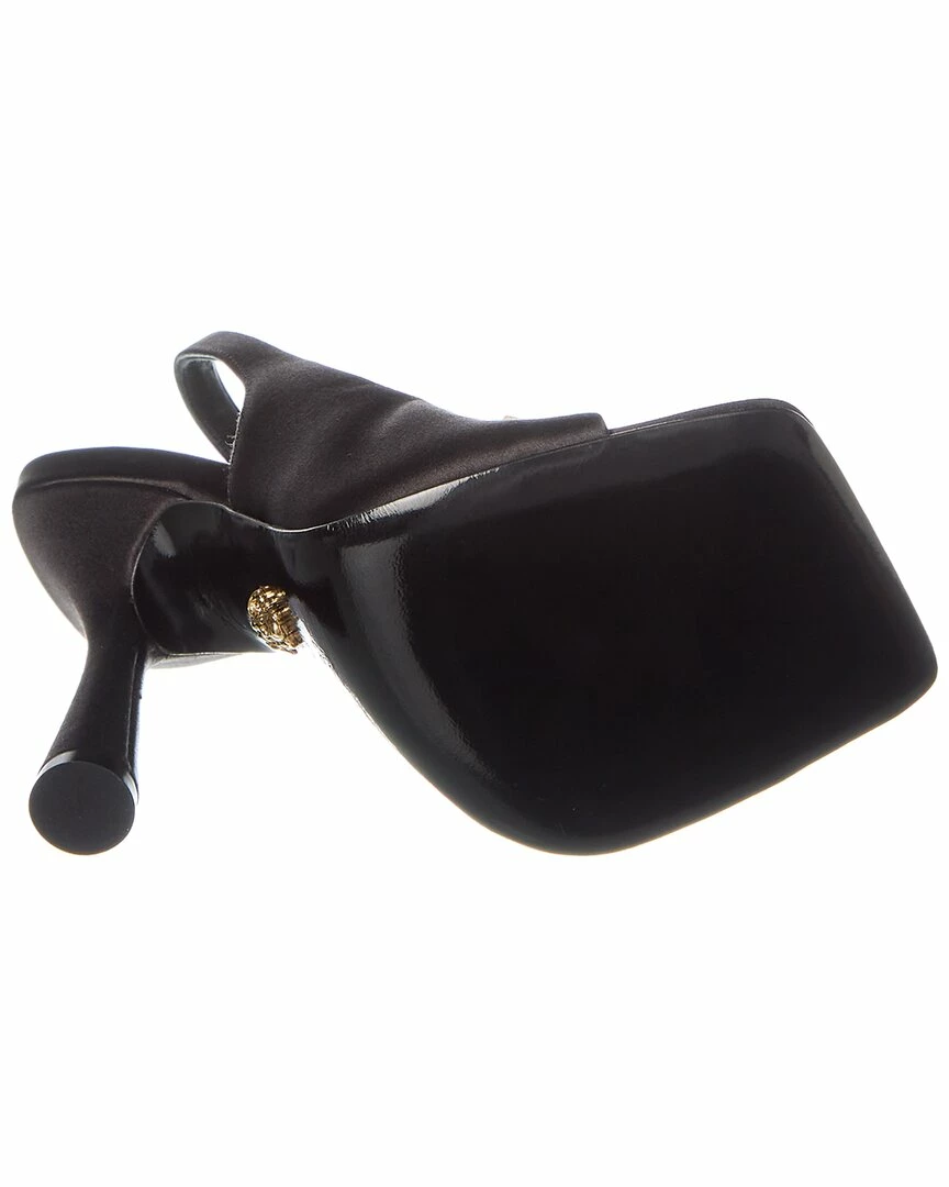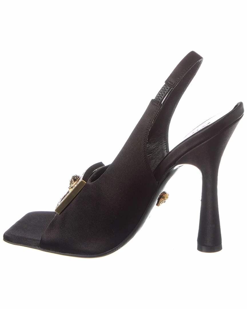 - Medusa Plaque Satin Slingback Sandal In Black Satin And Gold-Tone Hardware With Crystal-Embellished Medusa Head Logo Plaque
