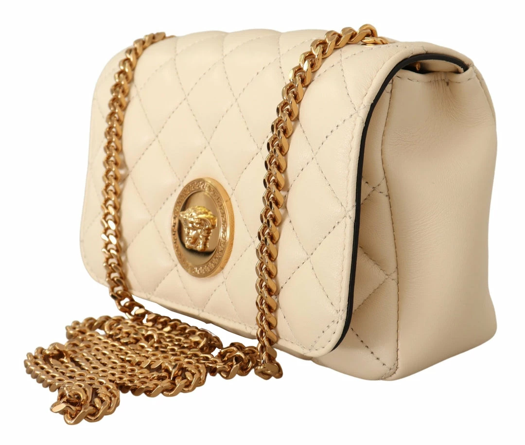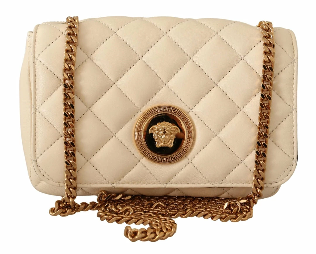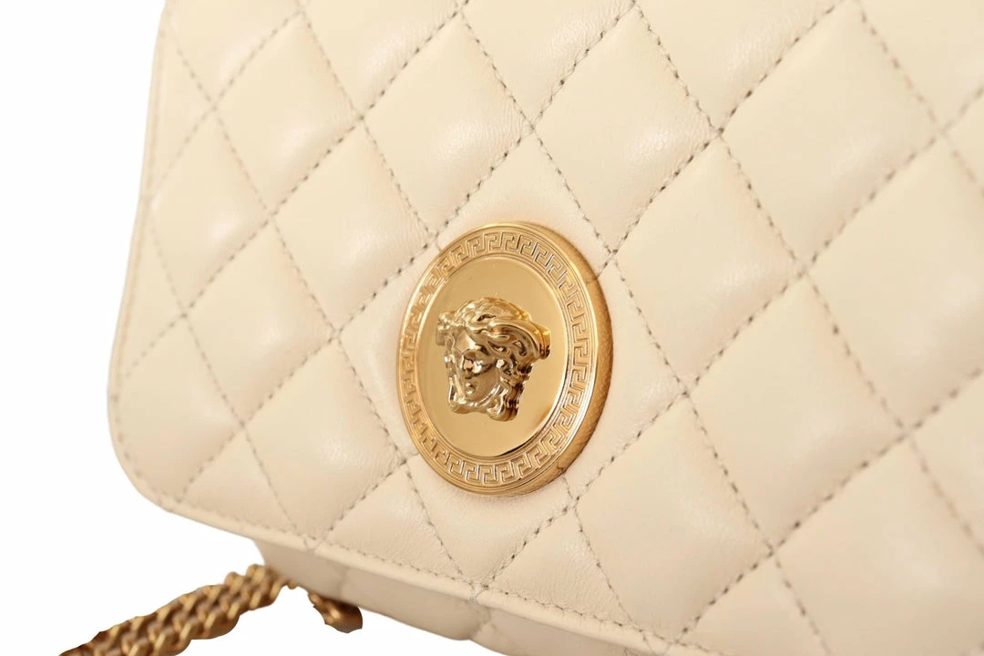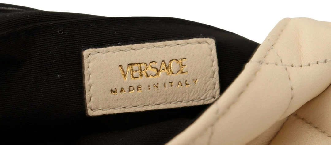 Details – Flap snap closure, medusa head logo, 1 main compartment, interior slip pocket, a gold-tone hardware with removable chain shoulder strap for shoulder or crossbody wear.