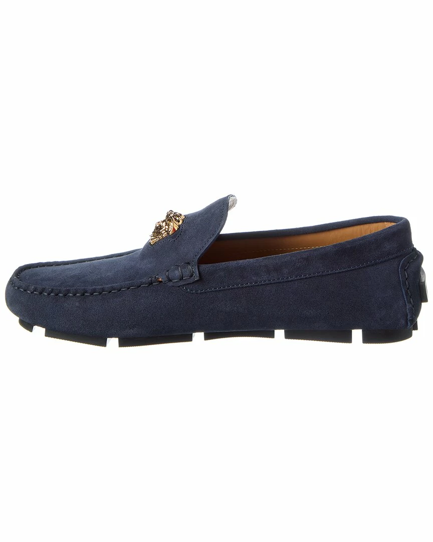 - Suede Driver In Navy Suede And Gold-Tone Hardware With Medusa Head Logo Accent