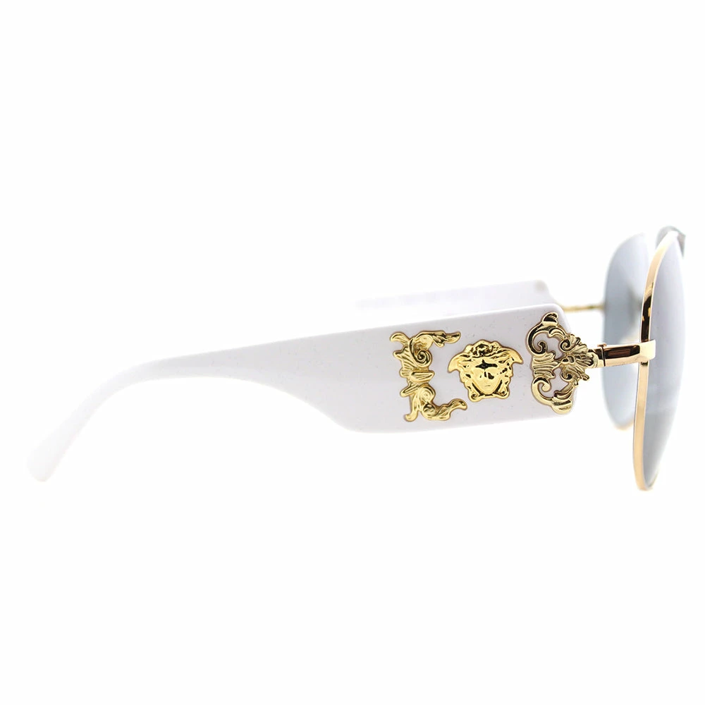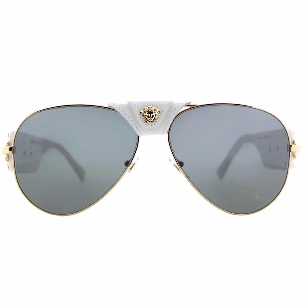 Versace VE 2150Q 134187 Unisex White Leather Gold Grey Lens Sunglasses Frame Color – White Leather Gold Frame Style – Aviator Frame Material – Metal Lens Color – Grey Lens Protection – UV Protected Includes – Versace box, case, cloth and paperwork *may vary from picture Size – Lens 62 mm x bridge 14 mm x arms 140 mm